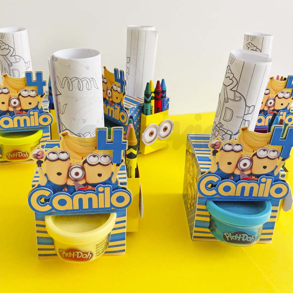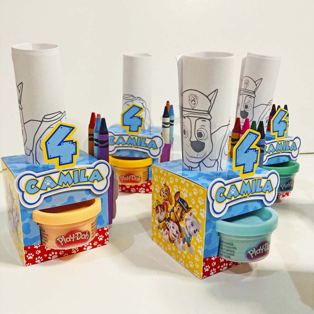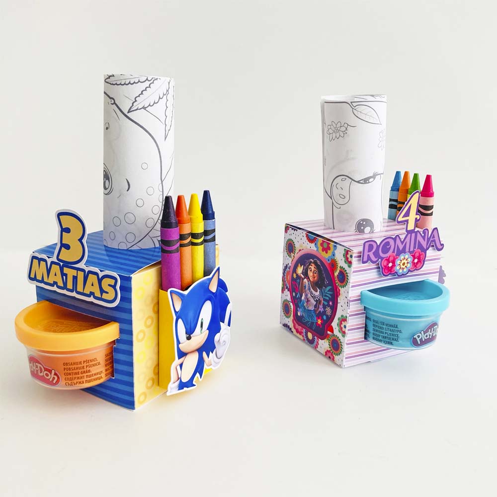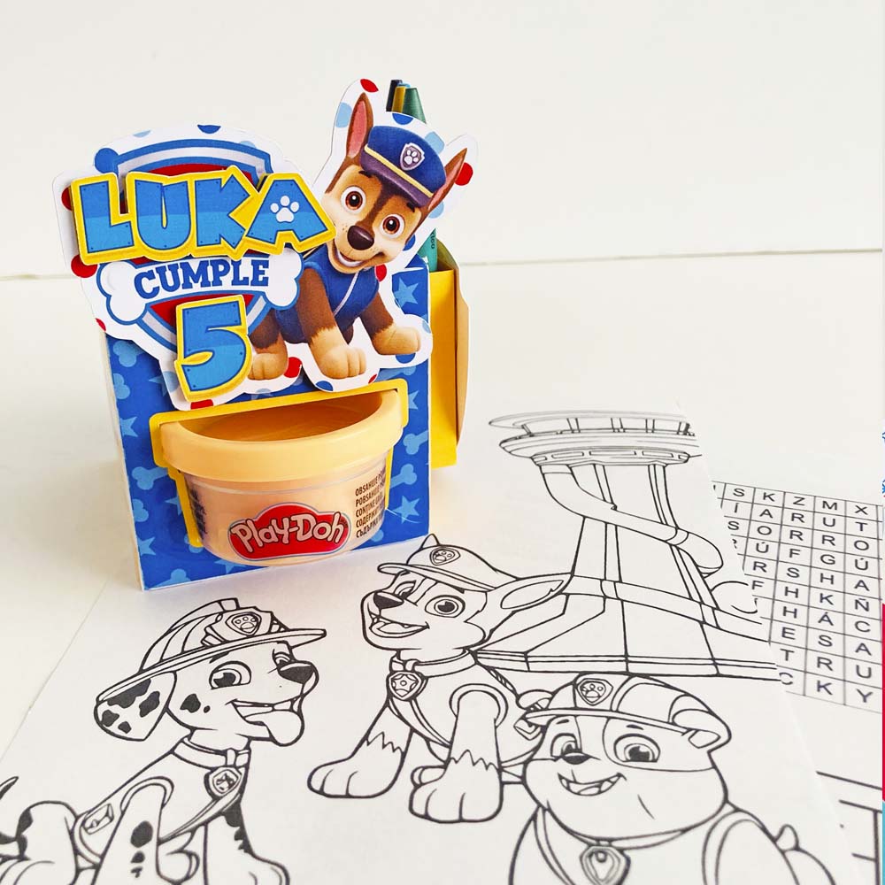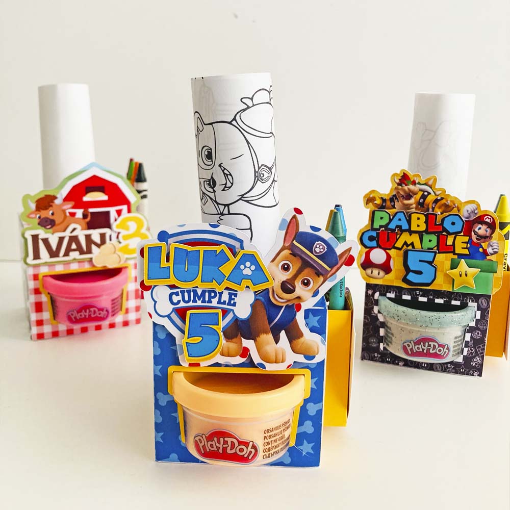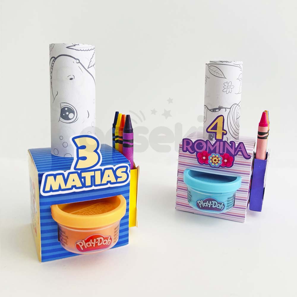 - Cajitas personalizadas con la temática de la fiesta (Cada cajita incluye un envase de play doh, 4 crayolas y 2 hojas de actividades).